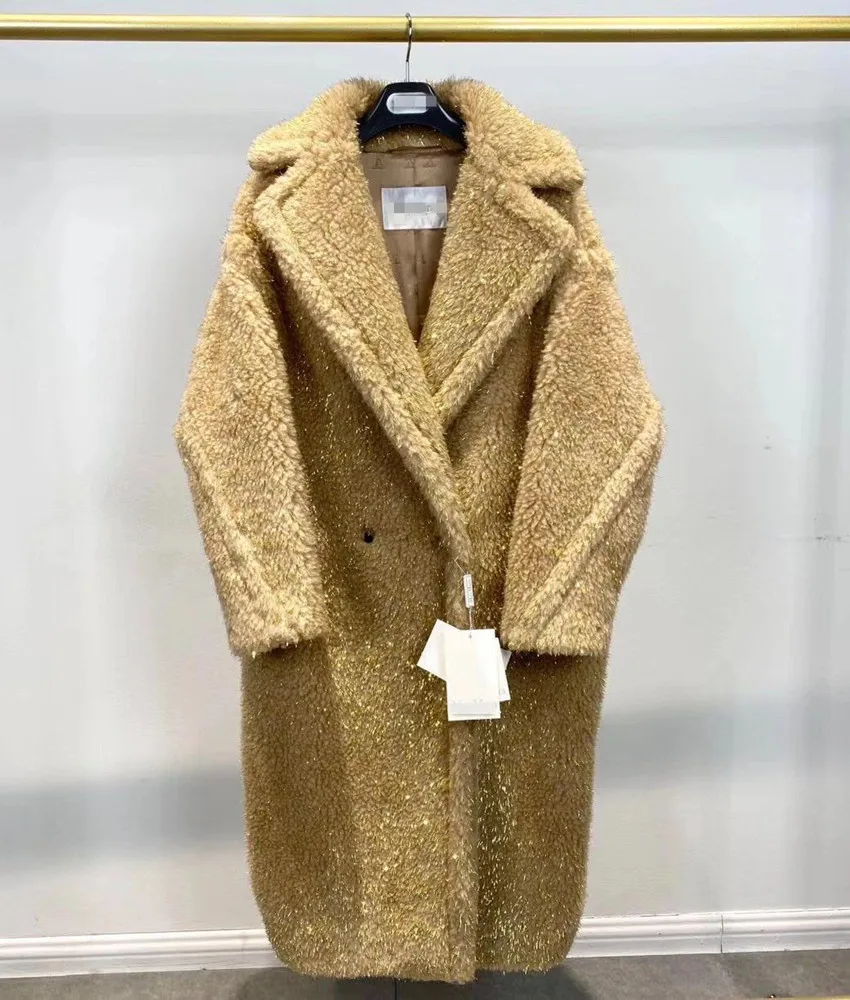 Women's Coat Gold Silk Teddy Bear Fur Coat Women Alpaca Coat Women Wool camel and silk coat Winter Thicken Coat High-end Coat